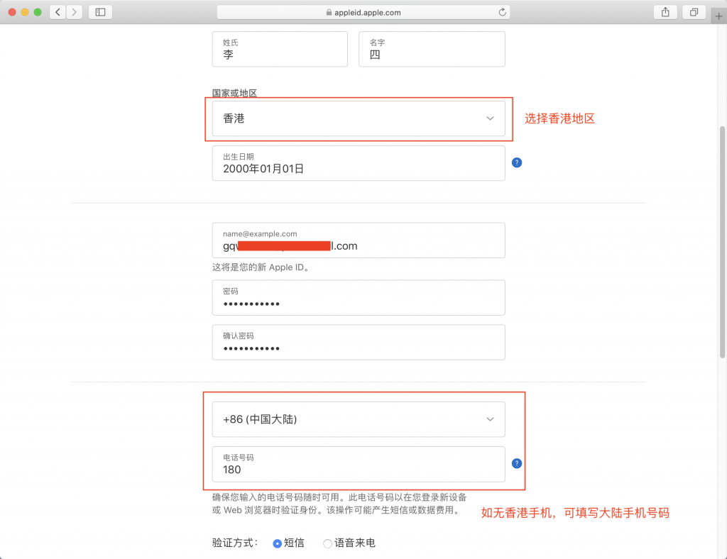 2.填写姓名、出生日期、邮箱、密码等信息,国家或地区选择香港, 填写待验证的手机号码,如无香港手机号码,可以选择并填写中国大陆手机号码。
